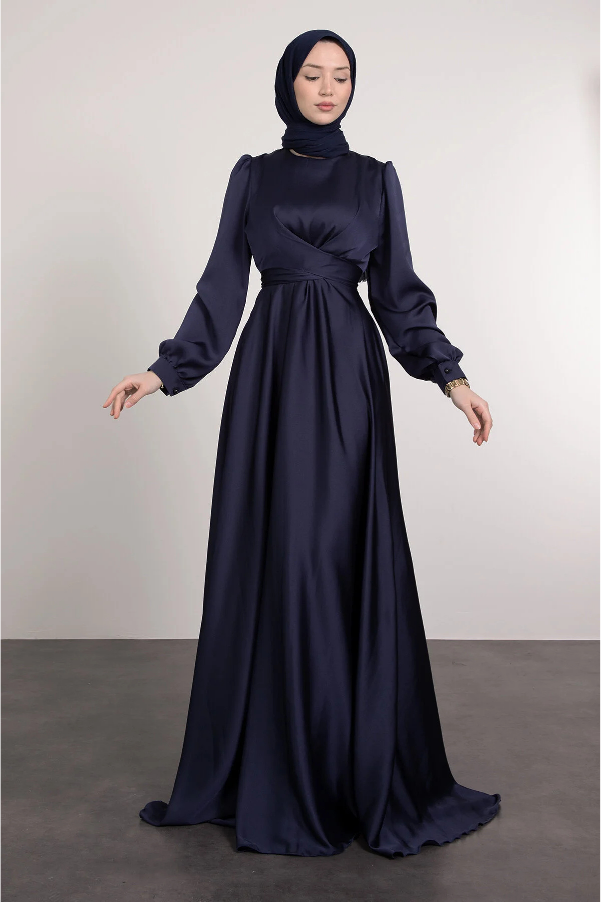 Yakadan Çaprazlı Bele Bağlamalı Tesettür Abiye- Lacivert