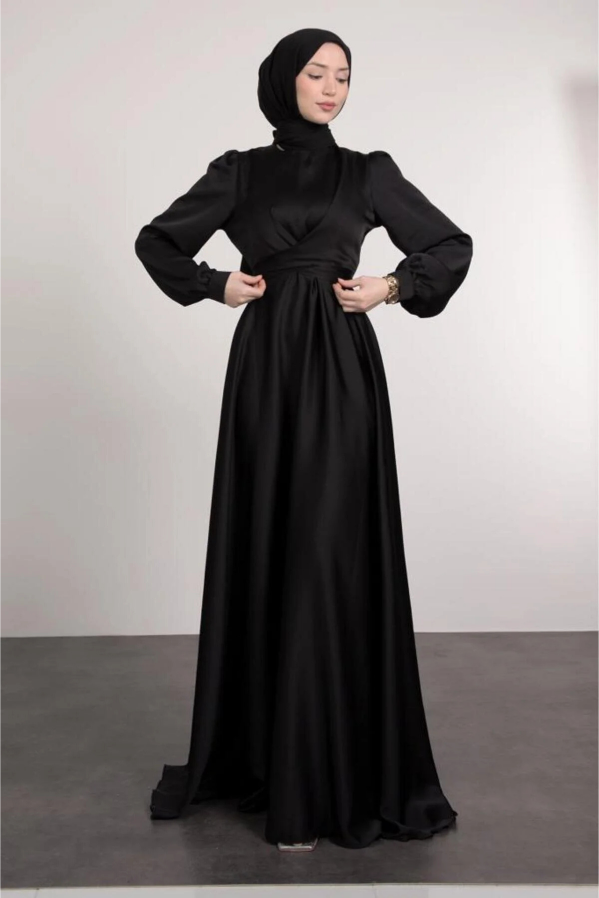 Yakadan Çaprazlı Bele Bağlamalı Tesettür Abiye- Siyah