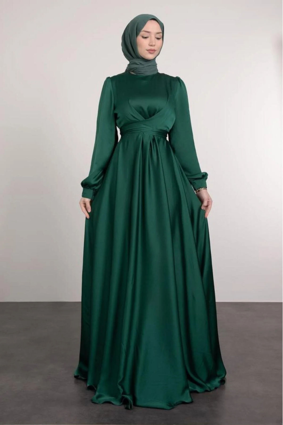 Yakadan Çaprazlı Bele Bağlamalı Tesettür Abiye- Zümrüt (TD257)
