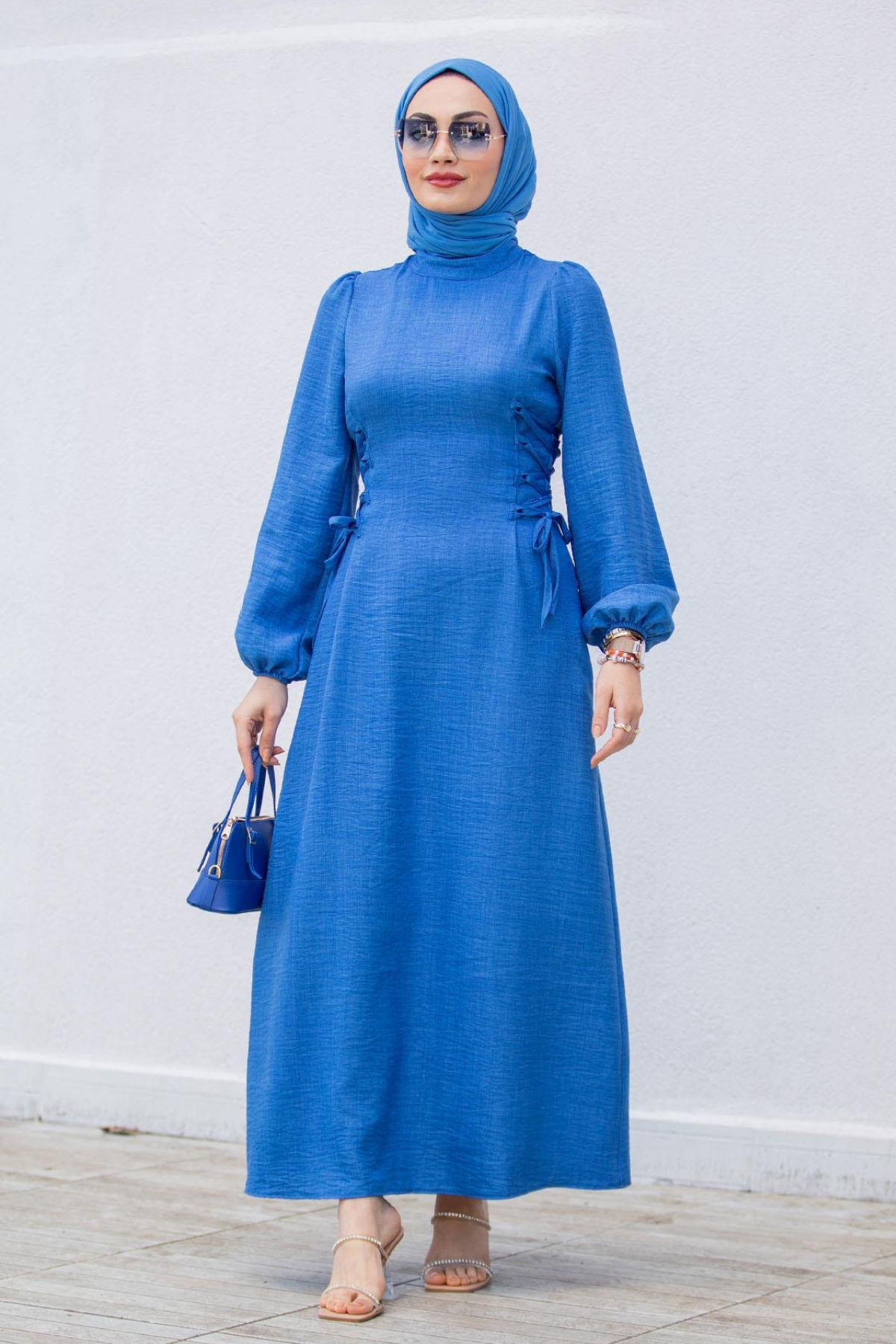 Yandan Çapraz Bağlamalı Keten Tesettür Elbise- İndigo (TD236)