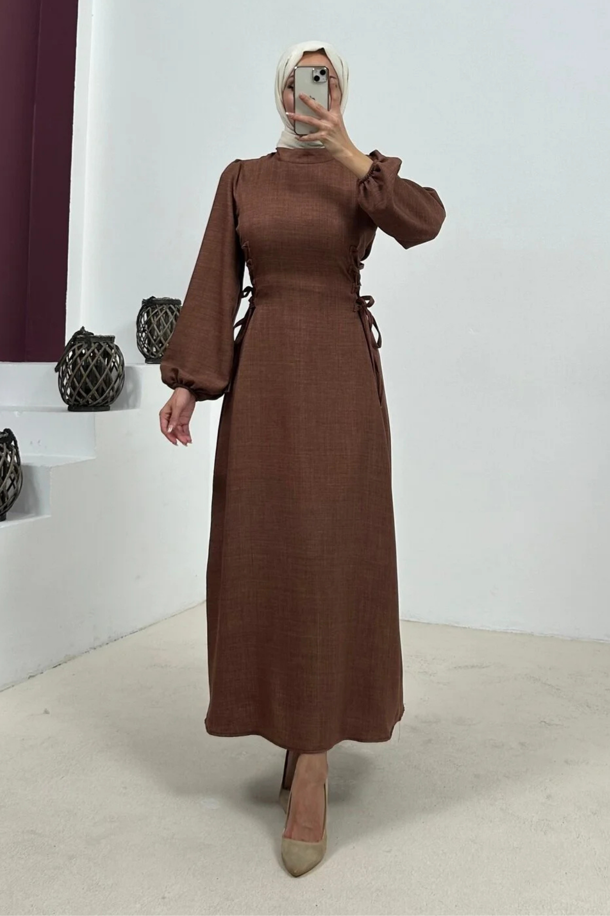 Yandan Çapraz Bağlamalı Keten Tesettür Elbise- Kahverengi (TD236)