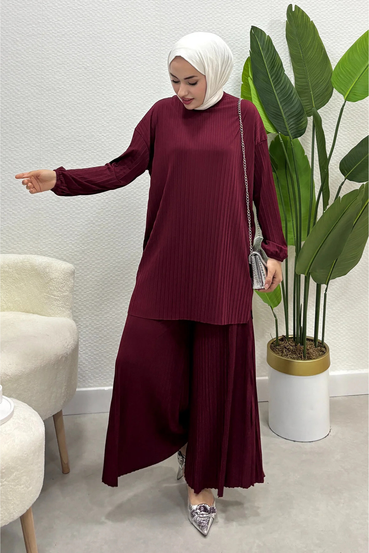 Yazlık İnce Sendy Kumaş Piliseli Tunik Pantolon Tesettür Takım- Bordo Standart Beden (38-44 Uyumludur) (TD242)