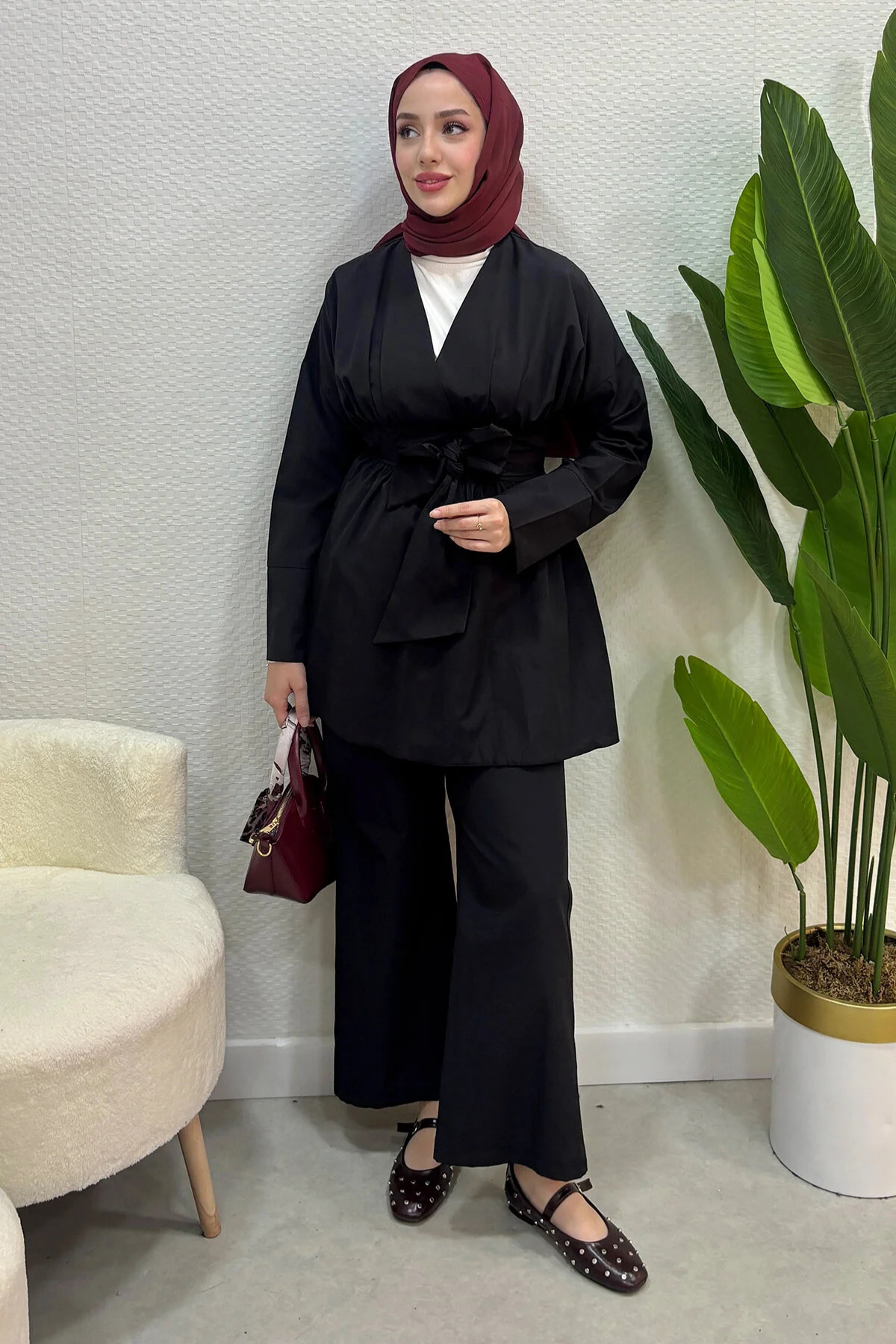 Yazlık Kumaş Beli Kuşak Detaylı Alt Üst Tesettür Takım- Siyah